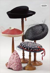 Konv. Damenhüte, 50er Jahre, 1 hochwertig gearbeiteter schwarzer Damenhut, Samt, Made in France, Ellys James, seitl. 2 Haarkämme zur Befestigung, 1 strohgeflochtener Damenhut mit Reiherferdern beschmückt, 1 Damenhut bordeaux/cremefarben, Ori.-Gage Label, 1 ausgefallen gearbeiteter Damenhut, bestickt mit kl. Perlen, gemarkt Dinels Longbeach; 1 Haarschmuck für Dutt