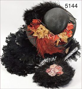 Konv., ca. 1910, schwarzer geflochtener Hut (Taufe), 3-teiliger Straußenfeder-Schmuck in schwarz und kupferrot, Stoffblumenbesatz, Haarnadelschmuck, Kopfdurchm. 13 cm, dazu 1 ausgefallene Damentasche mit schwarzen Straußenfedern und Stoffblumendekor, 1 Kettentrageriemen, Druckknopfverschluss, Innenfutter Seide, 18 x 21 cm, dazu passend 1 Federfächer, wohl Pfauenfedern, teilw. Federverlust, 35 cm lang