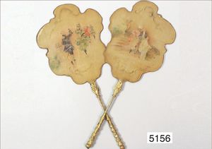 2 frühe herrschaftl. Damenfächer, ausgefallene Form, Seidenpapier beklebt, filigrane Handbemalung, prachtvoller Messingblech vergoldeter Halter, 47 cm hoch, an minim. Stellen der Ränder verschlissen, sonst schöner Orig.-Zust.