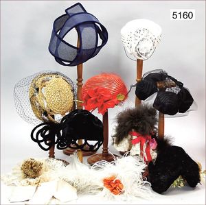 Konv. Damenhüte aus untersch. Zeiten, 1 Hut 1930, innen Leder, Hersteller Finane Cazenaue 19, Cours Maréchal Foch., bordeaux, dazu weiße Hauben, ca. 19. Jhd, prachtvoll gearbeitet, mit altem Blumendekor, sowie Federn, ca. 10 Stück, u.a. 1 Samthaube, schönes Konv., geeignet für Museen