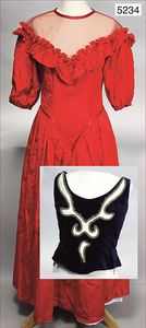Konv. 1 Damenkleid, rot, ca. 1950, prachtvoll genäht, für Kostümball, ca. Gr. 38, dazu Corsage, blauer Samt, wohl selbst genäht