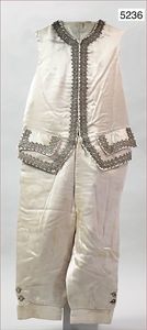 Damenjacke, ca. 1910, rosafarbene Seide, Samt mit leichtem floralem Muster, teilw. Seide an vereinzelten Stellen altersbedingt verschlissen, feine Spitze an den Ärmelenden, sowie auf der Brust, mit Haken und Druckknöpfen, innen mit Verstärkungsstäben, kl. Stehkragen, dazu Damenrock, wohl 1890, Leinen, mit blau/weißer Borte am Rockende, guter Zust., 61 cm lang, schönes Konv., bitte besichtigen