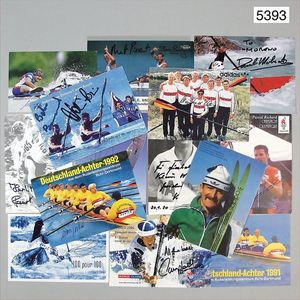 43 Autogrammkarten, Orig.-Unterschriften, Skispringer und Bobfahrer, u.a. Klaus Heidegger, Dennis Carbon, Bernd Krochewski, Aline Bonjour, Marder Günther, Patrick Ortlieb, Paolo De Cisa, Bobfahrer Enrico Kühn, Eislauf Marianne Timmer, schönes Konv.