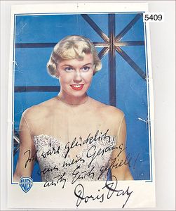 DORIS DAY Werbeplakat, A4, ca. 1950, Aufschrift: '' Ich wäre glücklich wenn mein Gesang auch Euch gefiele'' , kleinere Rissbildungen am Rand