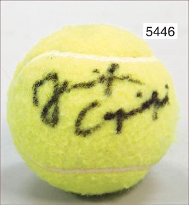 Tennisball mit Orig.-Unterschrift von Justine Henin, ehemalige belgische Tennisspielerin. Ihre größten sportlichen Erfolge waren der Gewinn von sieben Grand-Slam-Titeln im Einzel, sowie der Goldmedaille bei den Olympischen Spielen