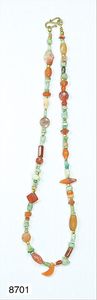 Weiß geätzte Karneolperlenkette, 3tes Jahrtausend vor Chr.(1te baktrische Bronzezeit), teilweise ältere Goldperlen (min GG 750/000), Mittelperle granuliert, Länge der tragbaren Kette ca. 54 cm