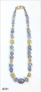 Calcedon Steinperlenkette ( Saphirin), um 1200 vor Chr.(bronzezeitlich), die 29 unterschiedlichen Steinperlen werden ergänzt von zwei Amethysten und einer fac. Zentralperle aus der gleichen Zeit. Die Kette ist mit neuzeitlichen Goldperlen (min. GG 750/000) tragbar zusammengestellt, Länge ca. 50 cm