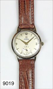 Herrenarmbanduhr, OMEGA, Edelstahl-Double, Lederband, Automatik Cal.342, mit Hammeraufzug, kleine Sekunde auf 6 Uhr, (komplett überholt mit Garantie), ca. 1950, guter Zustand
