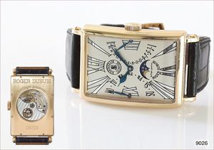 Herrenarmbanduhr, ROGER DUBUIS, “Much More bi Retrogate“, Ref.M34 Kal. 5740 5/3.6, Automatik, Mondphase, Gehäuse: Rose Gold 750/000, gewölbt 34x45,Höhe 11 mm,gebläute Zeiger, Saphirglas, verschraubter Boden, Boden mit Sichtfenster, Tag / Datum auf 9 und 3 Uhr, Nr. 09/28, (NP 2006 33.000,-€)