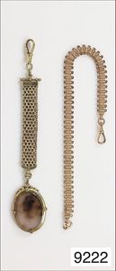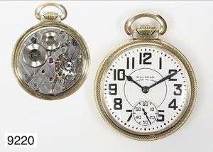 Taschenuhr, WALTHAM, Double, mit Uhrenkette, 20/30er Jahre, feiner Haarriss im Emaillezifferblatt, Steine in Schraubchatons, 15 Juwelen, mehrere Reparaturzeichen, Uhr läuft, Aufzug beschädigt