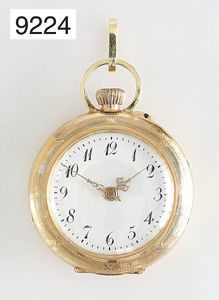 Damentaschenuhr , GG 585/000, als Anhänger umgearbeitet, Rückseite feine Gravur, Uhr läuft (reinigungsbedürftig)