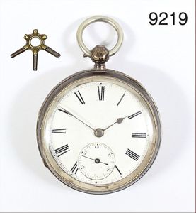 Englische Spindel-Taschenuhr, Silber 925/000, Spitzzahn-Ankerhemmung, vor 1900, original Aufzugschlüssel & Holzständer, reinigungsbedürftig
