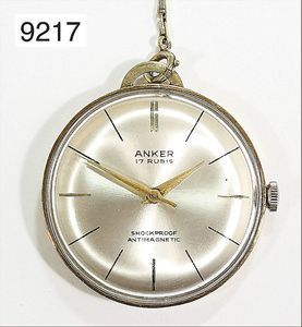 Taschenuhr, HUBER (Doctor´s Watch), Metall, gebläute Zeiger, Stoppfunktion, kleine Sekunde auf 6 Uhr, leichter Abplatzer auf dem Emaillezifferblatt, Uhr läuft, Metallkette und Schutzgehäuse