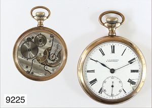 Taschenuhr, J.A.EMOND,MONTREAL, gold filled, verschraubter Deckel und Boden, kleine Sek.auf 6 Uhr, Emaille auf 5 Uhr, beschädigt, Zenith-Werk, Steine durch Metalllager ersetzt, rücks. Gravur "Pferd"