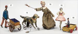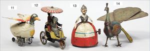 Kreisel, Ballerina, Blech lithogr., 14,5 cm, bespielt, altersbed. Lackfehler, Aufzieh-Zahnstab fehlt