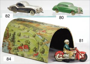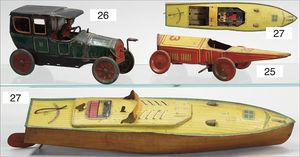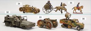 HAUSSER 3-Achser, mit Mannschaft und Brückenteilen, seltene elektr. Ausführung, mit elektr. beleuchteten Scheinwerfern, Elektro-Motor, 27 cm, guter Zust., techn. nicht geprüft