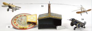 BING Flugzeughalle, Aeroplanstation, Blech lithogr., mit 2 kreisenden Flugzeugen, 1 Tragfläche liegt lose bei, bespielt, Uhrwerk intakt, 30er Jahre, Gebäude 16 cm x 20 cm