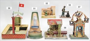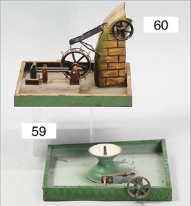Antriebsmodell, Sägewerk, Blech lithogr., deutsch, Vorkrieg, Grundplatte 21,5 cm x 23,5 cm, bespielt, altersbed. Lackfehler