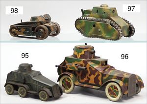 Panzer-Spähwagen, Blech lithogr., Vorkrieg, 24 cm, 3 Kanonen, Fahrerfigur, Uhrwerk intakt, guter Zust., mit altersbed. Lackfehlern