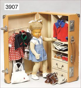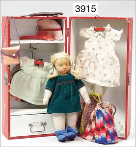 KRAMER Guck in die Welt Puppe, im Orig.-Koffer, Holzkopf, Stoffkörper, Mädchen, 33 cm, mit Zubehör
