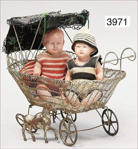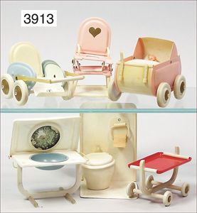 Konv. Celluloid, Baby im Hochstuhl, Höhe 9 cm, 1 aufklappbarer Waschtisch, Höhe 6 cm, 2 Kinderwagen, 12 cm lang, 1 Celluloid-Toilette, 9 cm hoch, ausgef.