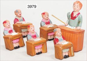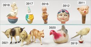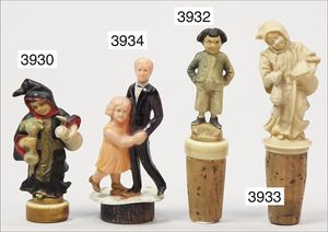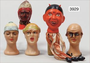 Celluloid, außergew. Einbindeköpfe, (Korkfigur), 1 x Indianer, 6 cm Höhe, 1 x Mann mit Mütze, 6,5 cm, 1 x Teufel, gem. Juno Germany, mit Korken 10 cm, dazu 2 Damen, ausgef. Gesichtszüge