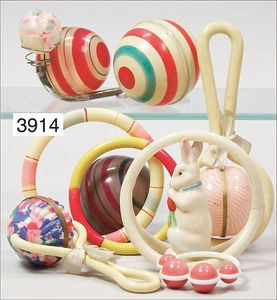 Konv. Celluloid, Babyrasseln, untersch. Gr., 1 Celluloid-Hase, 11 cm hoch, selten, ausgef., 1 Blasespiel mit Celluloid-Ball, 18 cm, schönes Konv.