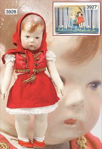 KÄTHE KRUSE Puppe, Nr. 1, im Rotkäppchenkleid, 3 deutlich sichtbare Hinterkopfnähte, blaue gemalte Augen, Strahleniris, einzeln abgenähte Daumen, breite Hüfte, alte Schuhe, altes Kleid, 42 cm, sehr schöner Orig.-Zust.