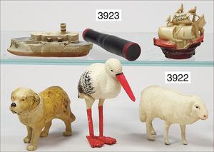 Celluloid, gem. Depose, Frankreich, Celluloid-Segelschiff, Seebad Ahlbeck, Höhe 6 cm, dazu Dampfer, einige Rissstellen seitl., 10 cm lang, 1 Fernglas, 9 cm lang