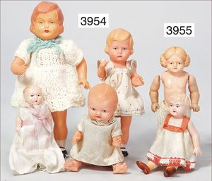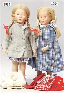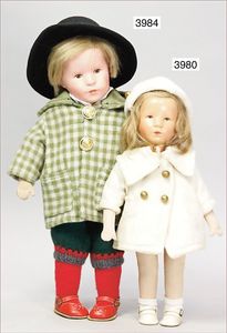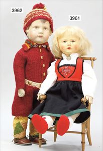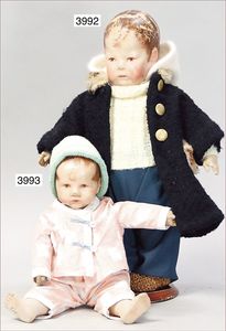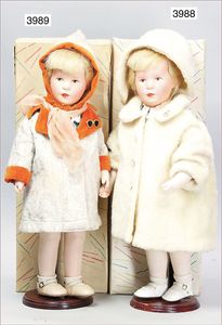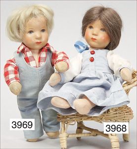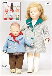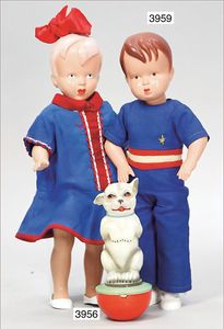 SCHILDKRÖT Sternchen u. Schnuppe, Mädchen, Celluloid-Drehkopf, blaue gemalte Augen, bewegl. Arme u. Beine, 31 cm, guter Zust., dazu Junge, Orig.-Kleidung, drehbarer Kopf, Arme u. Beine, mit Schuhen