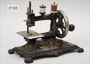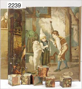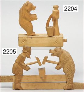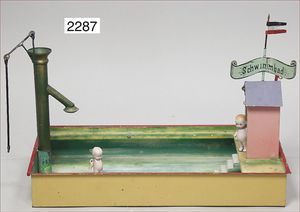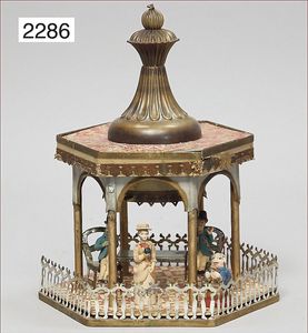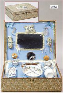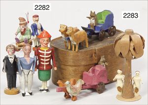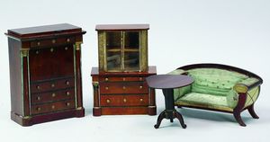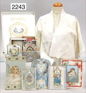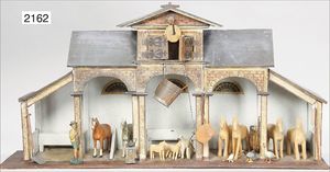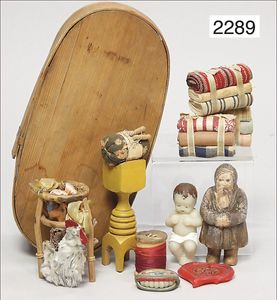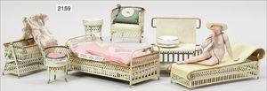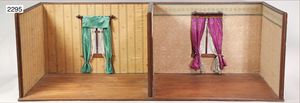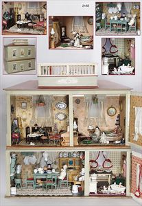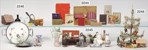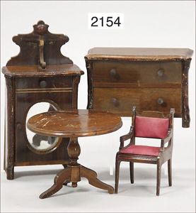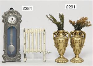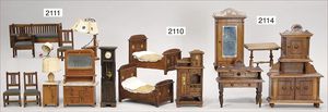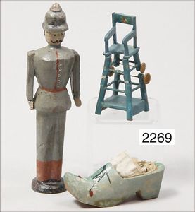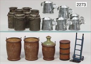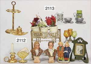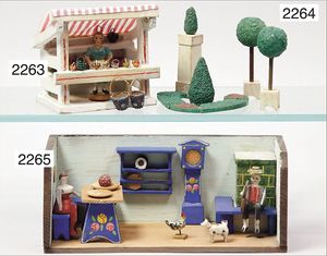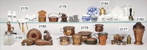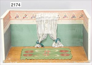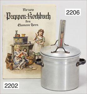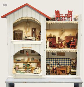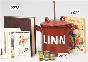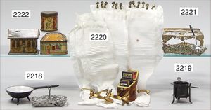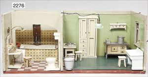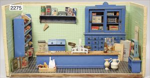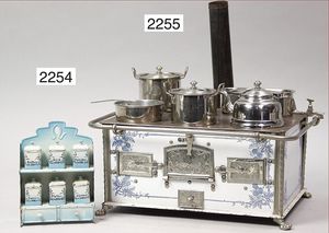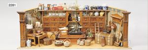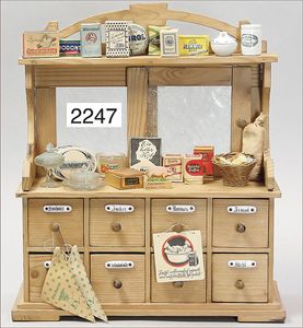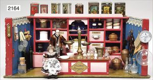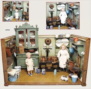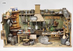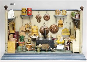 Rauchfangküche, 57 cm breit, 41 cm tief, Regale, Vorratsschrank, Gänsestall, Feuerstelle mit Knopf zum verstellen des Kamins, Spülstein, Wand u. Boden mit Bierfarbe gestrichen, Regale, Brotschrank verschließt die Schubladen beim abschließen, Holz natur, reichh. Zubehör, Dreifuß mit Stiel und passende Kupferschüssel mit 2 Griffen, signiert: GUST. L. Hauer Frankfurt a. M., sowie Zinn-, Kupfer-, Messing-, Keramik- und Porzellanteile, Herstellungsdatum auf der Unterseite des Gehäuses "Weihnachten 1897, Henriette Jourdan"Brief mit der Familiengeschichte liegt vor und wird mitversteigert, sehr dekorativ