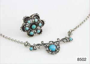 Lot: Kette, 51 cm; Ring, RW ca. 51; Brosche ca. 2,8 x 2,6 mm, jeweils mit Türkis, alle Teile in GG 585/000