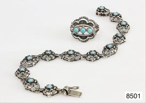 Lot: Armband 835/000 Silber, 12 Türkise, Kastenschloß, Länge 19,0 cm, Ring 835/000 Silber, 3 Türkise; RW ca. 58,5