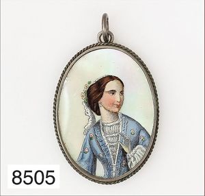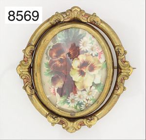 Sehr große Wendebrosche um1910 England( Metallpunze), Metall vergoldet, 1 x Blumenbild, 1 x Mädchen mit colloriertem Blumenstrauß, H. 78 x 71,0 mm