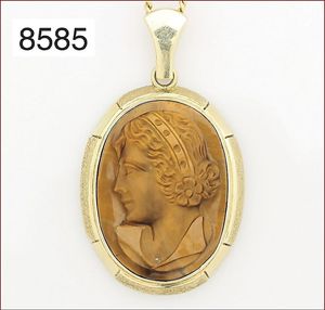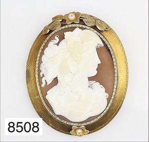 Brosche, GG 585/000, (nicht gemarkt, Säure geprüft), Muschelgemme (kleiner Ausbruch oben rechts), 2 Perlen, um 1860/1880, 50 x 41 mm