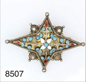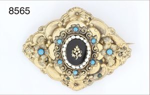 Brosche, Trachtenschmuck um 1870/80, Metall vergoldet in mehreren Ebenen aufgebaut, reich verziert, Onyx mit Blumen Applikation umrandet von Perlen und Türkiskugeln, ca. 81,0 x 64,0 mm