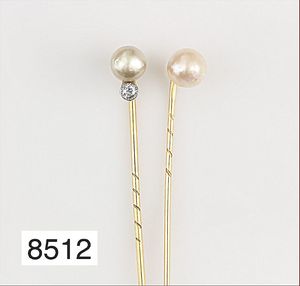 Lot: 2 Nadeln, GG 585/000, Altschliff-Diamant ca. 0,05ct, weiß-piquet, Akoja-Perle, Nadel GG 750/000, Akoja-Perle