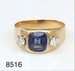 Ring, Wien um 1880/90, GG 585/000, 1 Saphir-Kissen, feine Farbe, ca. 2,0 ct, (altersbed. Tragespuren), 2 Brillanten ca. 0,36 ct w-si/piquet (später eingearbeitet), RW ca. 58,5