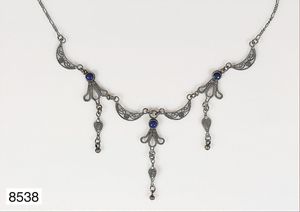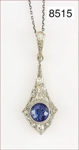 Feiner ART-DECO Anhänger, GG 585/000, in Platin ausgefasst, sehr feiner, facettierter Saphir ca. 1,5 ct, 9 St. Altschliff-Diamanten u. Rosen ca. 0,20 ct, Kette, Silber, 47 cm