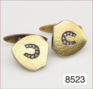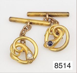 Manschettenknöpfe, feiner JUGENDSTIL um 1900, GG 585/000, 1 Altschliff-Diamant ca. 0,07 ct, weiß, 1 Saphir