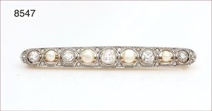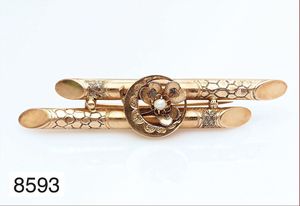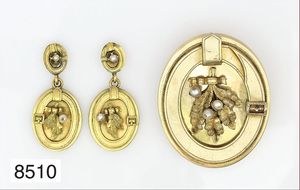 Lot: Double-Brosche mit Perlen, 41,5 x 34 mm , Double-Ohrstecker mit Perlen, als Hänger gearbeitet, um 1860/70