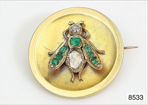 Außergewöhnliche Brosche, Frankreich um 1860/70, „ Fliege“, GG 750/000, ausgefasst mit 4 Diamantrosen ca. 0,55 ct, 7 Smaragde (Fliege verschraubt), D = 30,5 mm, schöner Original Zustand, total 12,6 g, Sammelwürdig !!