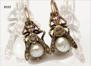 Sehr ungewöhnliche Ohrhänger, 2. Hälfte 19. Jhd. „ Fliege“, GG 585/00, 22 Diamantrosen (1 Stein fehlt), 2 Barockperln und 4 kl. Rubincab., Höhe ca. 17,0 mm