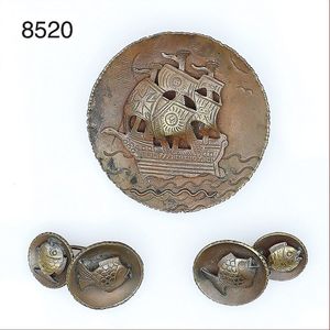 FISCHLAND-SCHMUCK, Fa. GEORG KRAMER JUNIOR, 40er Jahre, Brosche „Schiff“, ca. D = 49 mm, Manschettenknöpfe „Fische“, ca. D = 21,5 mm Durchmesser, alle Teile gemarkt !!