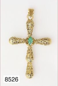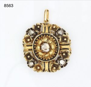 Ausgefallenes als Anhänger umgearbeitetes Schmuckstück, GG 750/000, mit 5 Diamantrosen ca. 1,3 ct, florales Blütendekor und Emailleeinlage, Spanien um 1840-1850