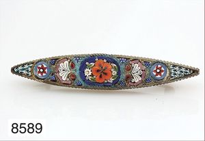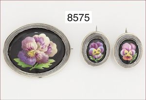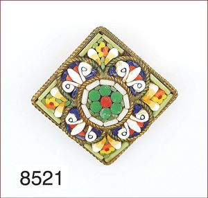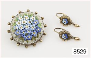 Lot: Brosche um 1870, sehr feines Florentiner Mosaik, Metall verg. D = 2,4 cm u. Ohrhänger, Double, bemalt