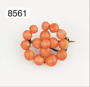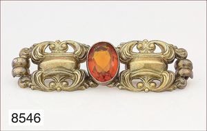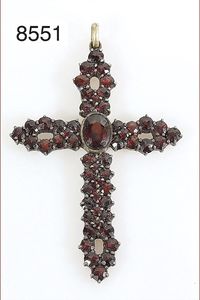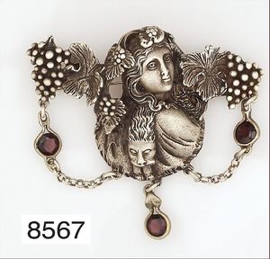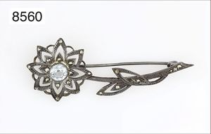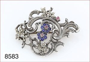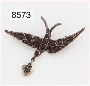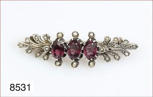 Nadel, ENGLAND, viktorianisch um1880, nachpunziert mit 800/000 Silber ! (Stadtwappen überschlagen!), schwere Ausführung, 3 facettierte Granate, (Broschierungsstift muss neu verstiftet werden), B. 60,8