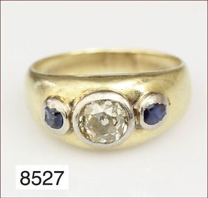 Diamantring, GG 585/000, Diamant-Altschliff ca. 0,55 ct, getönt-Piquet, 2 Saphire, (altersbed. Tragespuren), Steine in weiß gefasst, ca. 5,2 g, RW ca. 49