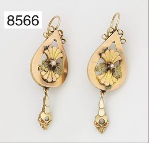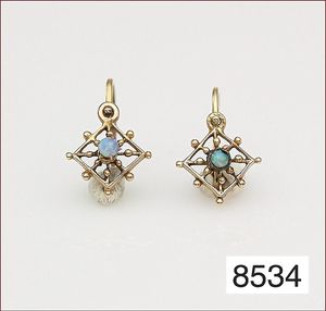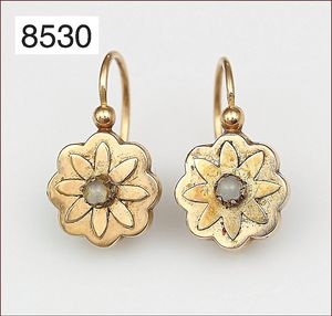 Ohrhänger, HISTORISMUS, 1860/70, deutsch/französisch ?, GG ca. 500/000, kleine ½ Perlen, Hänger wohl später, mit weißem Stein