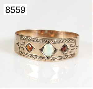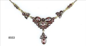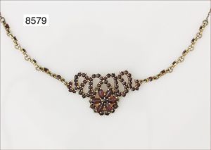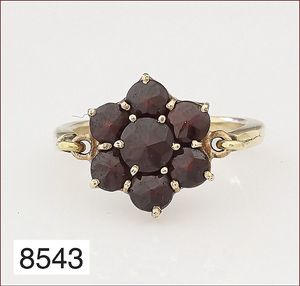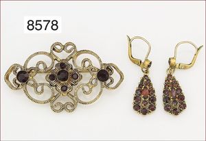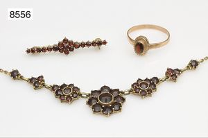 Lot: Granatschmuck, Ring, GG 333/000, RW ca. 58,5, Nadel, Metall vergoldet, L 37,5 mm, Collier, GG 333/000 gest., 43,0 cm